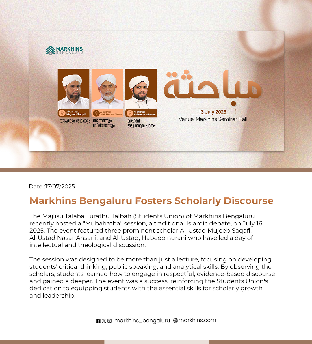 The Majlisu Talaba Turathu Talbah (Students Union) of Markhins Bengaluru recently hosted a "Mubahath...